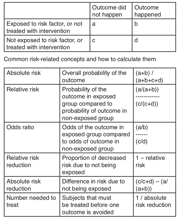 Relative risk is calculated as (Incidence of exposed/Incidence of unexposed) = (a/a+b)/(c/c+d). A relative risk < 1 indicates a negative association, > 1 indicates a positive association, and = 1 indicates no association.