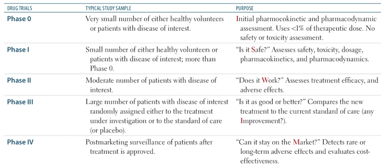 Phase I studies demonstrate safety on a small group, Phase II assesses effectiveness on a larger group, Phase III compares the new drug to standard care, and Phase IV investigates long-term effects.
