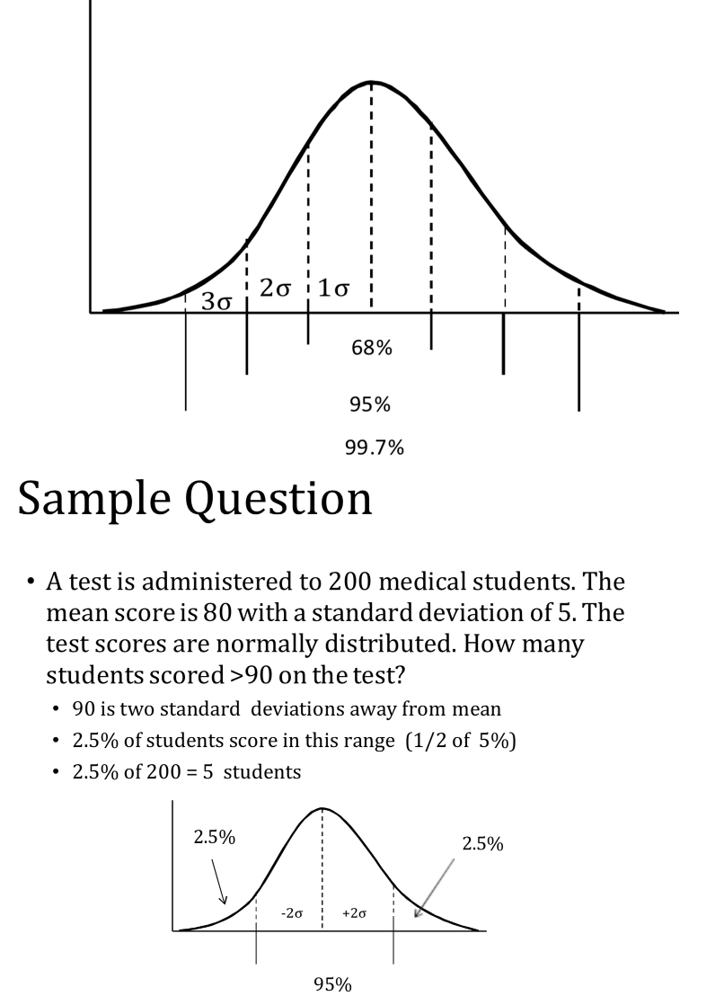 A normal distribution (Gaussian) is a symmetric bell-shaped curve. 1 SD includes 68% of samples, 2 SD includes 95%, and 3 SD includes 99.7% around the mean.