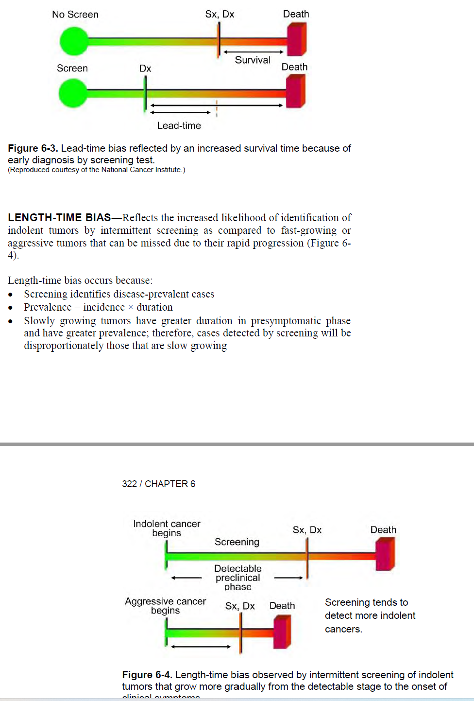 Length time bias- overestimation of survival (ppl who survive / ppl with disease) b/c detecting more earlier/slowly progressive cases (increasing the denominator)