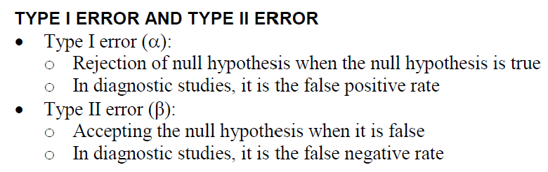 Type I error (alpha) = false positive rate- reject the null hypothesis when null hypothesis is true