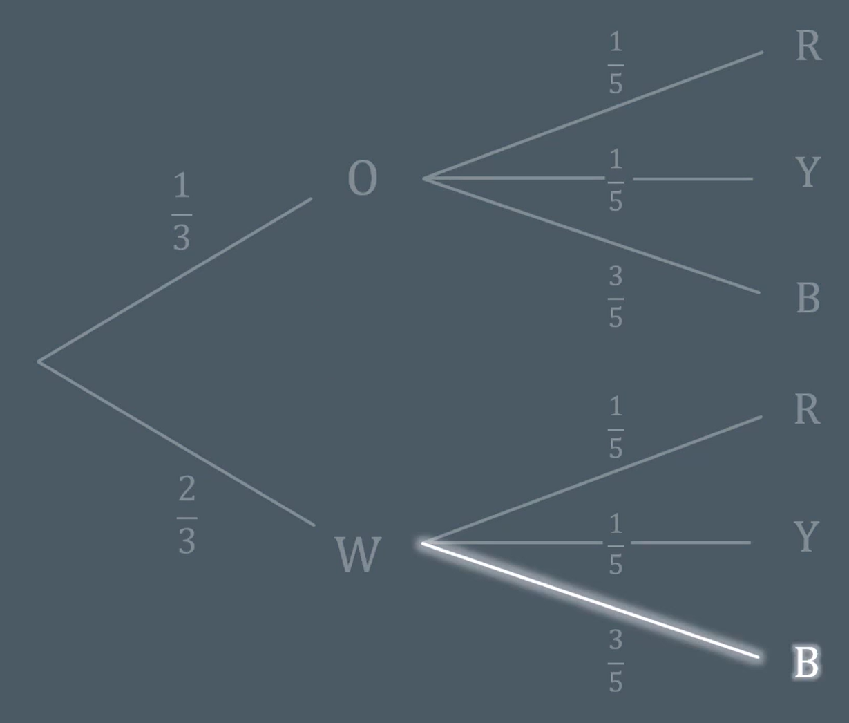 What does the probability 3/5 on the branch represent in conditional probability notation?