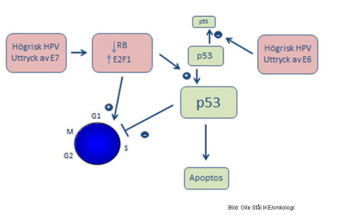 • E6 kan hindra p53 som degraderas (går ej i apoptos), dämpar interferonproduktion