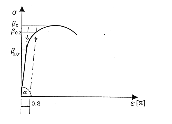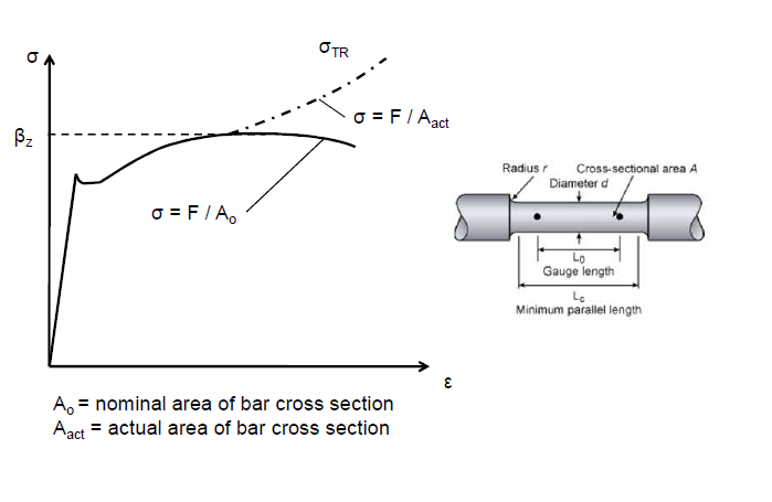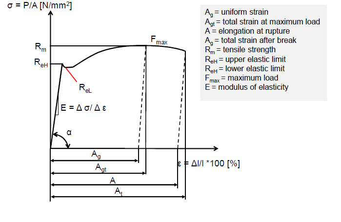In a uniaxial tensile test the stress-strain diagram of a reinforcing steel can be obtained. The stress (σ) is normally obtained by dividing the load by the original section of the specimen at the beginning of the test. The stress-strain relationship is subdivided into different ranges, as indicated in Figure.