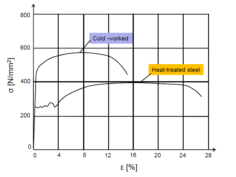 Stress – strain relationship of hot-rolled steel. Diagram and ranges.