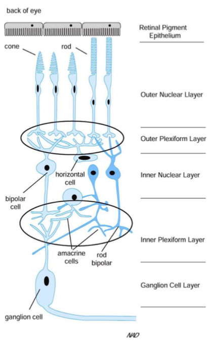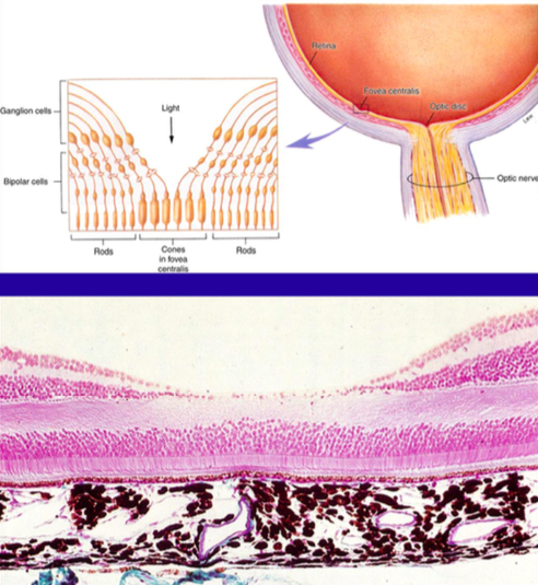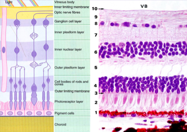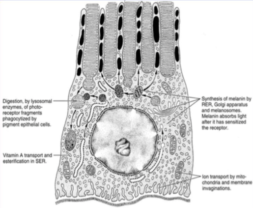 Describe the retinal pigmented epithelium and its 4 main functions.