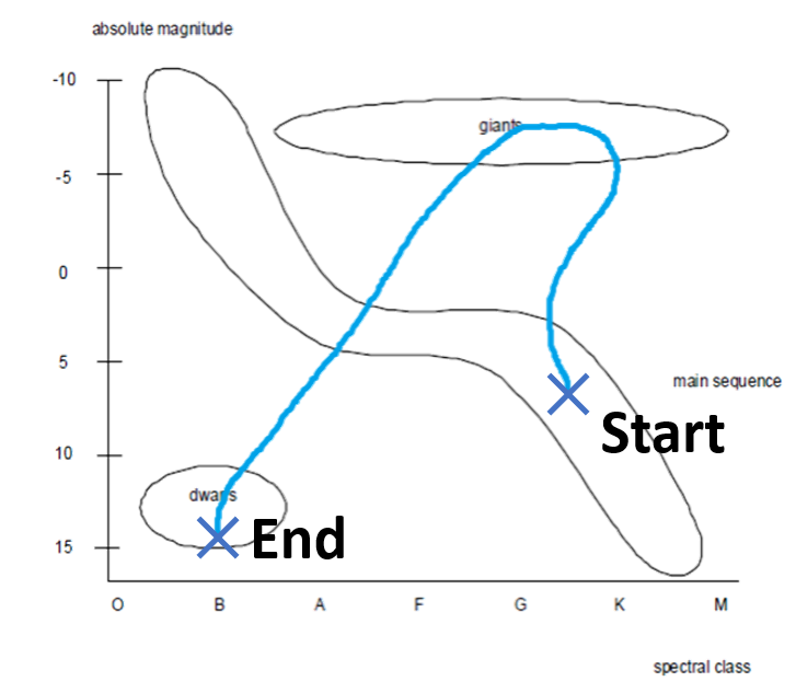As the Sun runs out of Hyrdogen in the core how does it progress along the Hertzsprung-Russel Diagram?