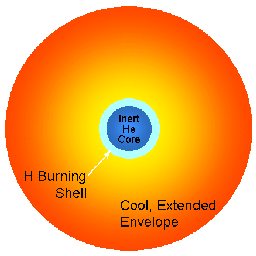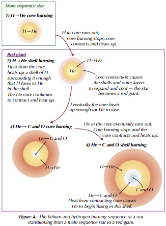 Core Hydrogen → Helium burning (Main sequence → red giant) Shell Hydrogen → Helium burning Core Helium → Carbon and Oxygen burning Shell Helium → Carbon and Oxygen burning