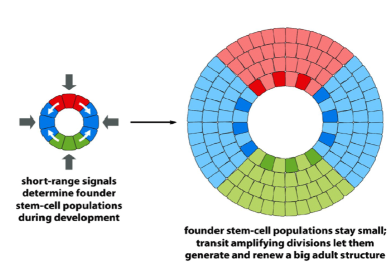 Short range signals that determine stem cell populations and operate for a few hundred cell diameters.