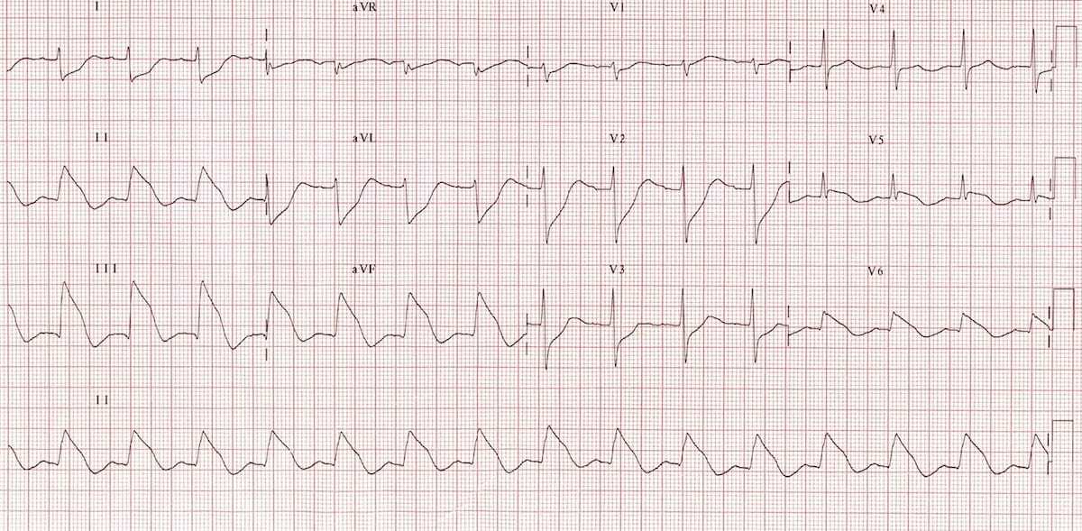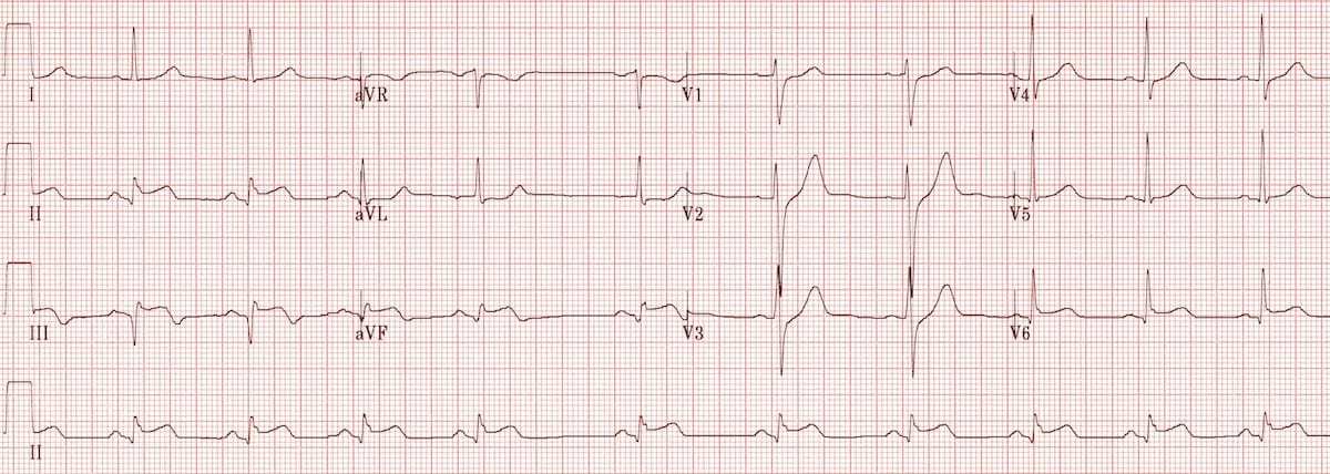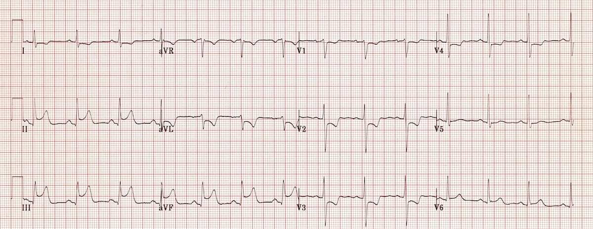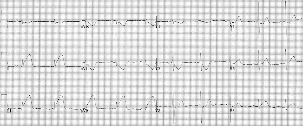 The concave ST elevation in II, III and aVF may be mistaken for pericarditis.