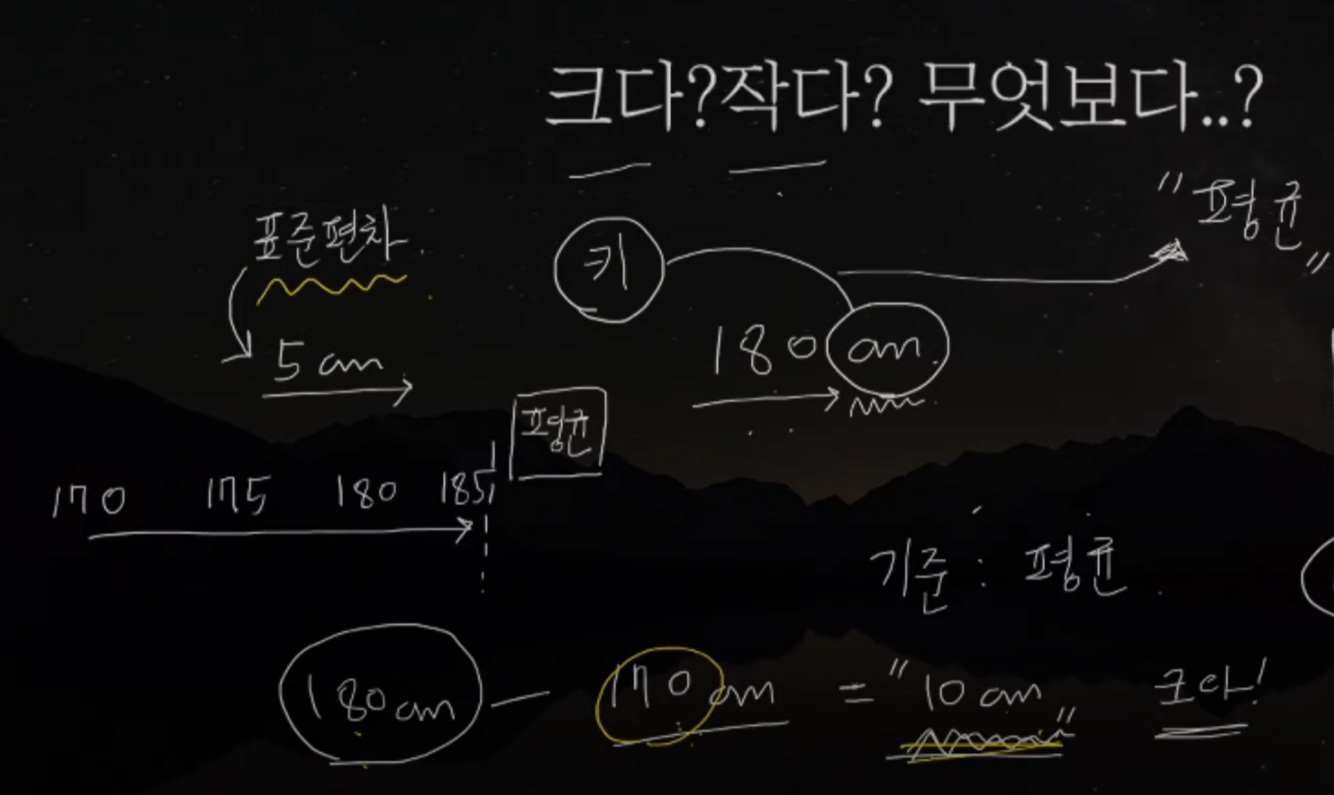 표준 편차는 그럼 뭔가? 이건 평균으로 부터 얼마나 얼마나 떨어져 있는가를 나타내늗 단위 : 170센티가 키 평균이규 표준편차가 5센티이면 +2표준편차는 180센티인거지.