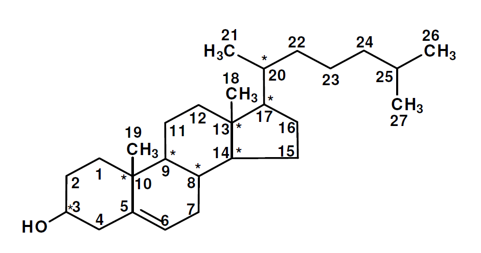 Cholesterol has 8 tetrahedral stereocenter and 28=256stereoisomers.