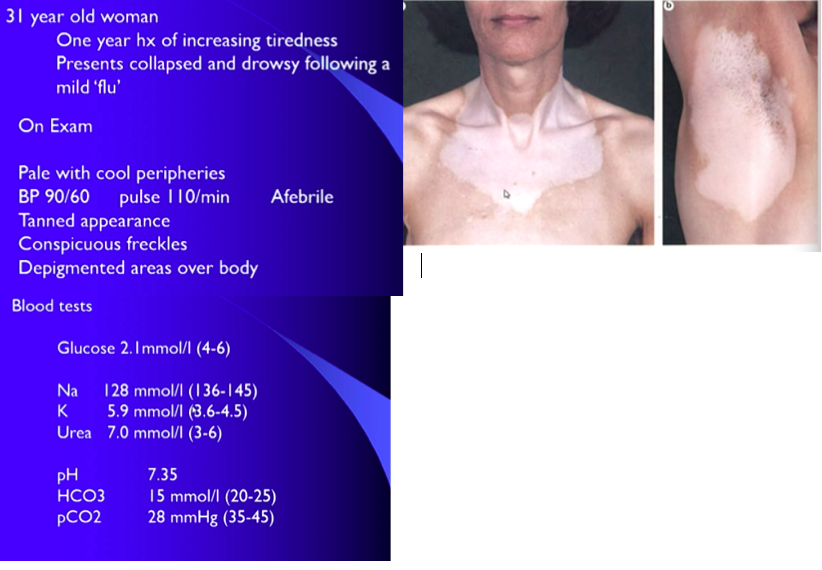 So she has hyponatraemia, hyperkalaemia, hypoglycaemia, intravascular volume depletion and metabolic acidosis