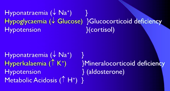 And Mineralcorticoid deficiency has Hyperkalaemia (inc K+) and metabolic acidosis