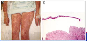 killing of keratinocyts by massive apoptosis, usually through CTLs, Fas-FasL, and NK cells