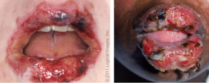 Mucosal lesions: 90% of cases, painful curstin lesions