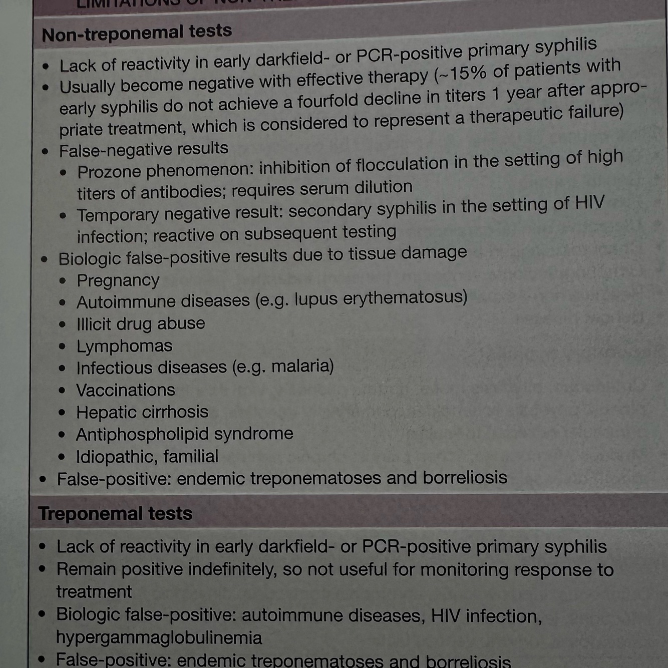 Treponemal - indefinitely positive, can see if has had syphilis or not any time. Positive at 10-90days.