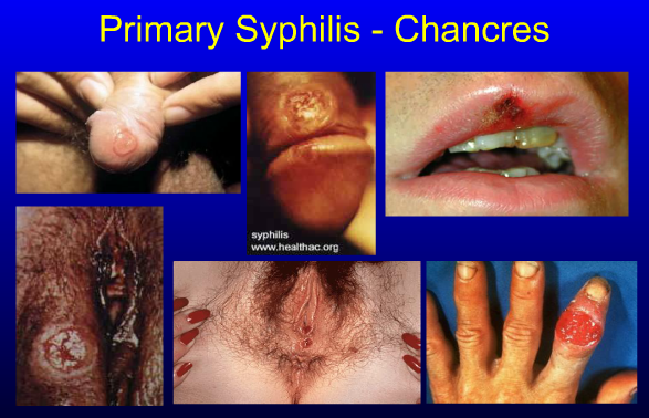 Remember that chancres can arise at any site but are always at the site of primary treponemal entry