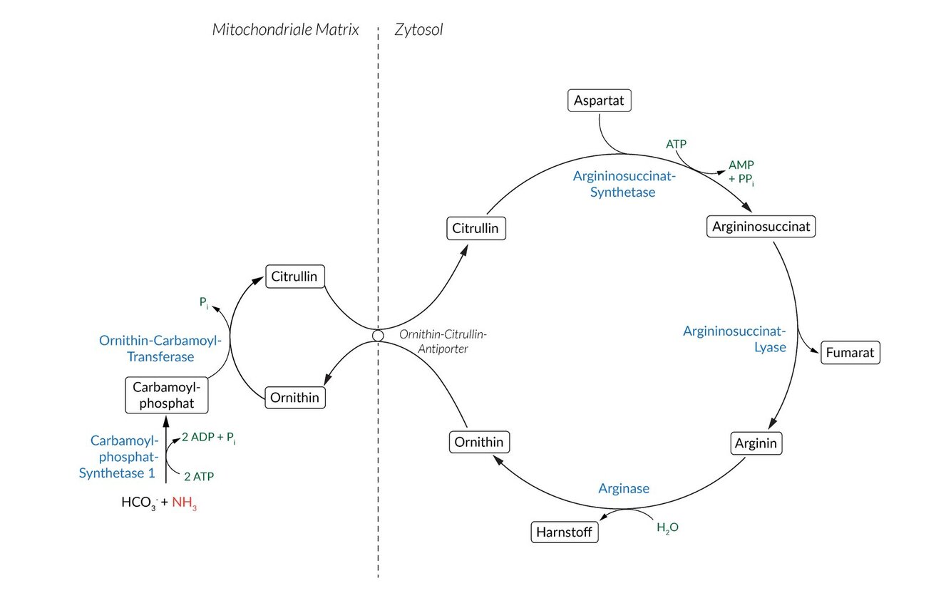 Am Ende ensteht Harnstoff (Urea), der übers Blut von der Leber zur Niere transportiert wird und mit dem Harn ausgeschieden wird und Ornithin, das wieder ins Mitochondrium überführt wird.
