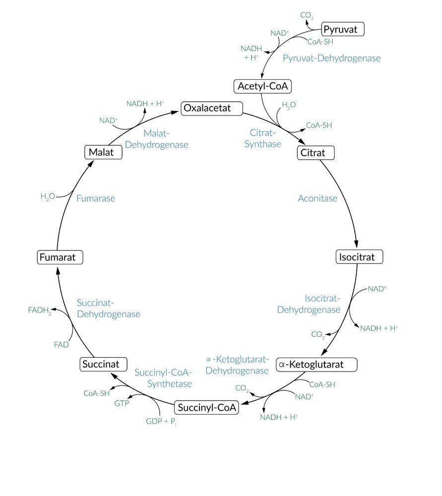 Beim Abbau von Glucose in der Glykolyse entsteht Pyruvat, das in Form von Acetyl-CoA in den Citratzyklus eingespeist wird, bei dem in 8 Reaktionsschritten insgesamt 3 NADH+H+, 1 FADH2 und 1 GTP entstehen. Die Reduktionsäquivalente NADH+H+ und FADH2 werden in der Atmungskette oxidiert, sodass die Energiebilanz ≙ 10 ATP entspricht.