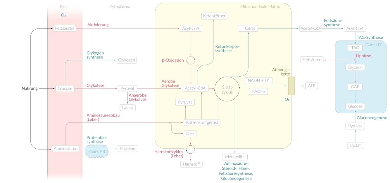 Der Citratzyklus findet nach der Glykolyse und der oxidativen Decarboxylierung von Pyruvat zu Acetyl-CoA, jedoch vor der Endoxidation in der Atmungskette statt. Es ist der gemeinsame Stoffwechselweg, mit dem der Abbau von Kohlenhydraten, Lipiden und vieler Aminosäuren endet.