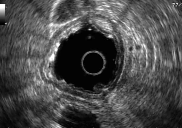 The lesion on EUS is arising from the third layer, which is the submucosa layer. It also appears hyperechoic. This is pathognomonic for a lipoma. Lipomas that are not causing symptoms and are incidentally found do not need any further management.