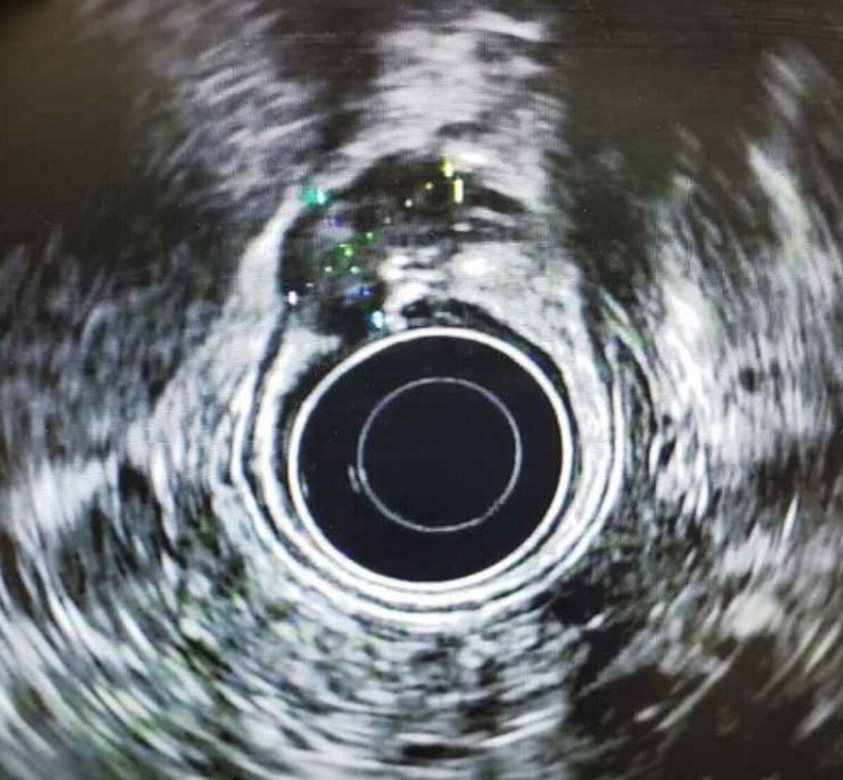 The lesion shown is a T2N0M0 based on the invasion of muscularis propria on EUS and absence of nodes and metastatic disease. Endoscopic resection of any modality is restricted to less than 3 cm (ulcerated) or 2 cm (poorly differentiated – expanded Japanese indications) lesions that do not have lymphovascular or perineural invasion and do not have invasion more than 500 microns (0.5 mm) within the submucosa (sm1). The NCCN guidelines have more conservative limits on the size of lesions that can be resected endoscopically, all guidelines agree that for T2 lesions, consideration of perioperative chemotherapy and surgery are current standard of care and should be recommended for this patient.