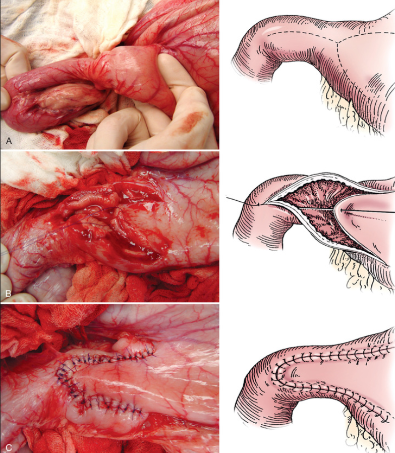 - Longitudinal incision through serosa and muscularis extending 1-2cm orad and aborad of the pylorus