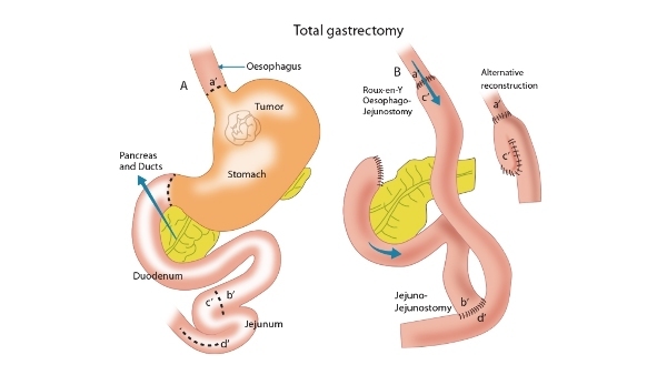 Stomach is removed and a Roux en- Y limb is sewn to the esophagus