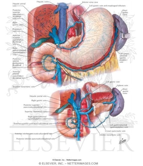 The general principle of the venous system of the stomach is that venous drainage of most of the GI tract drains to portal vein (hepatic portal vein), then througha second set of capillaries in the liver (liver sinusoids), and then to hepatic veins to IVC. The veins accompany the stomach arteries. The stomach veins drain to splenic, superior mesenteric or directly to hepatic portal vein – there is not a coeliac vein.