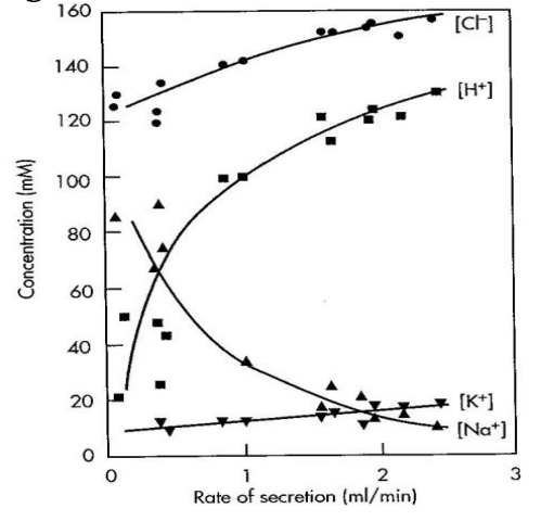 How do [HCl], [K+], and [Na+] change as the rate gastric juice secretion increases?