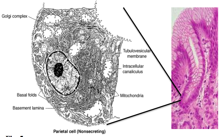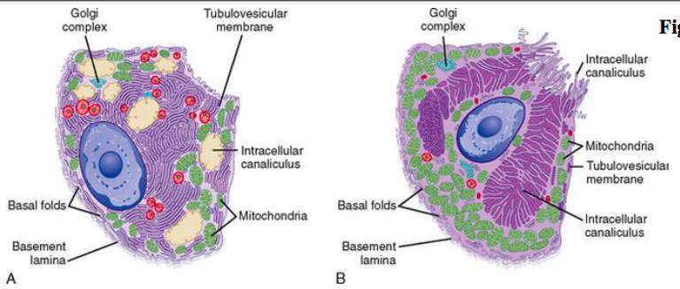 Resting state: tubulovesicles w H/K-ATPase are underneath the plasma membrane on the apical side.