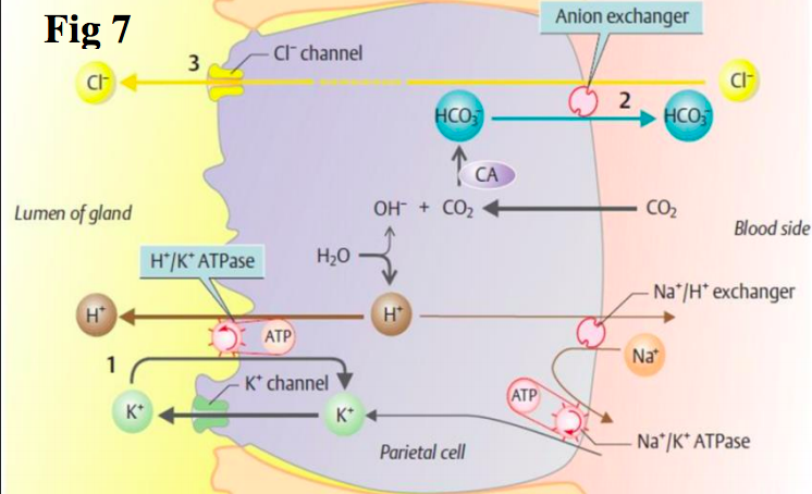 The effect of gastrin, Ach, and histamine will result in an increase in cAMP & Ca2+ –> greatly enhances H/K-ATPase –> more acid secretion