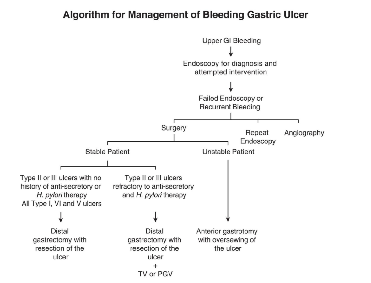 Indication for (and type of gastric ulcers) vagotomy and antrectomy (or pyloroplasty)