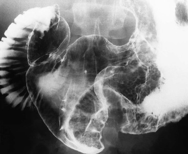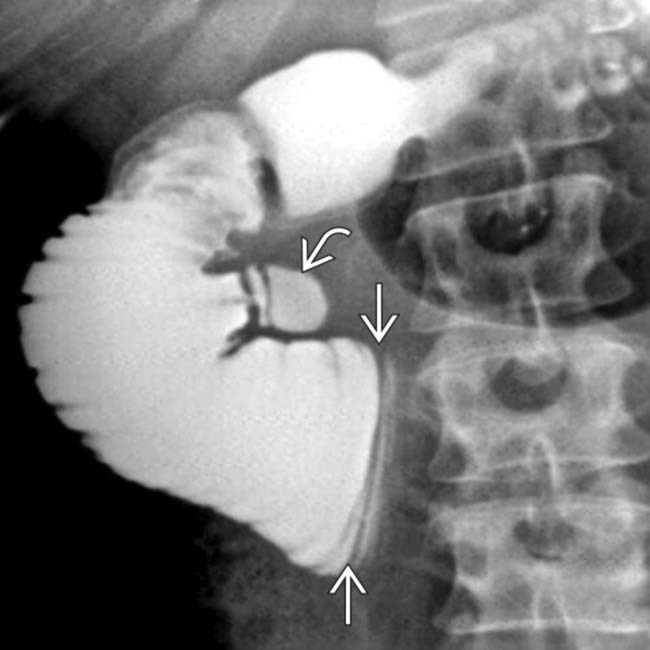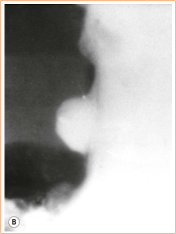 Gastric erosions or aphthous ulcers are superficial ulcerations that do not penetrate the muscularis mucosa. They usually appear as small, shallow collections of barium 1–2 mm in diameter surrounded by a radiolucent rim of oedema. These are called ‘complete’ or ‘varioliform’ erosions (Fig. 27-6A).