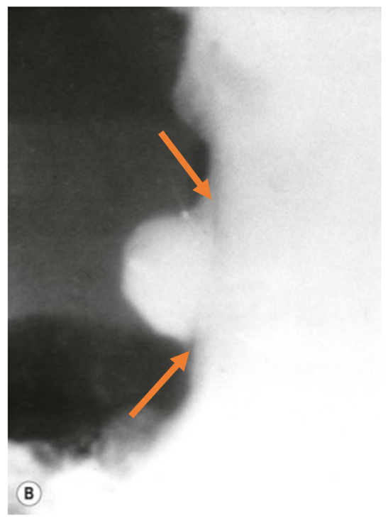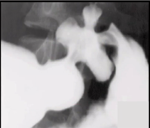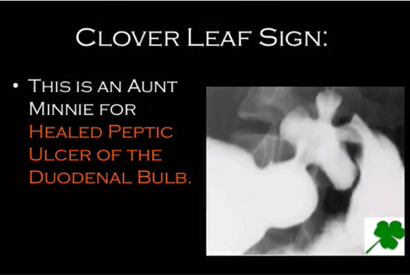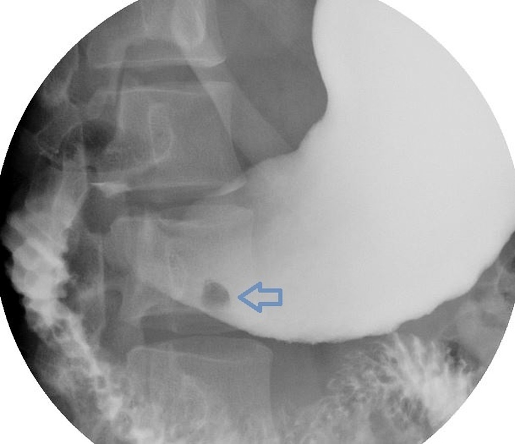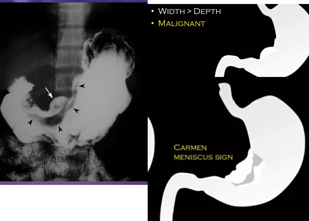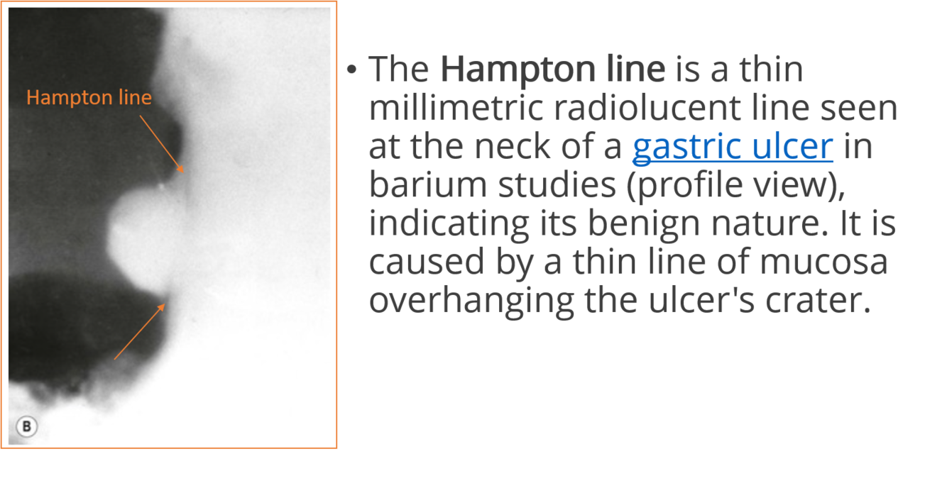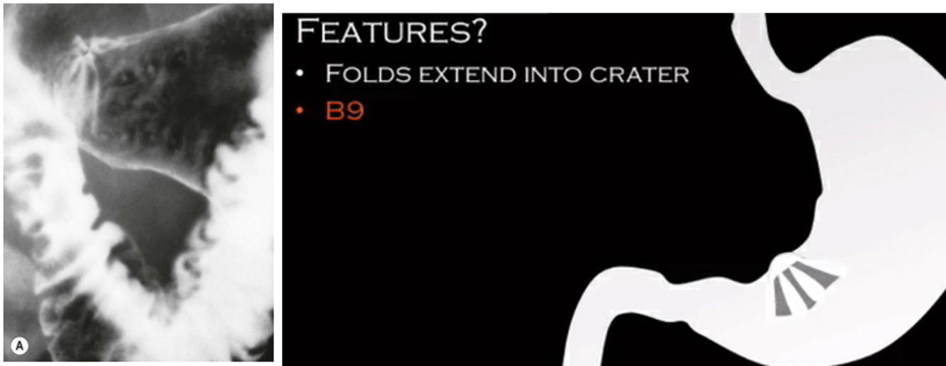 A small ‘pit’ of barium contained within an ulcer cavity in the body of the stomach: Bull’s eye sign