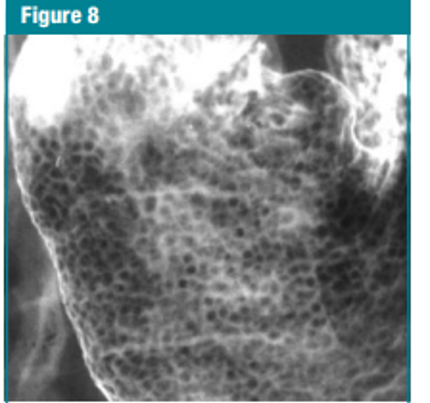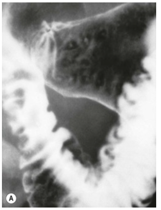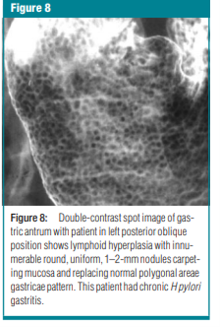 Gastritis is a descriptive term with sometimes conflicting pathological, endoscopic and radiographic definitions. It is now better understood that many causes of gastritis, including H. pylori, alcohol and NSAID gastritis, lead to similar morphological changes.30 The most common findings are thick (>5 mm) folds with or without nodularity