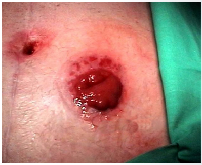 This suggests small bowel enzymes digesting the skin and this can lead to poor adherence of the stoma bag