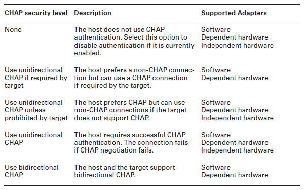 The target (storage system) authenticates the iSCSI adapter (initiator), and the initiator also authenticates the target. Mutual CHAP is supported for dependent hardware iSCSI adapters and software iSCSI adapters only.