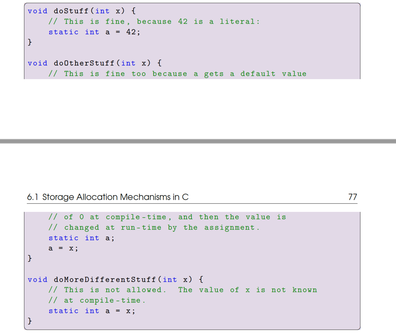 However, it is perfectly fine to assign the value of any variable to the statically allocated variable at a later time, as long as it is done separately, after the definition