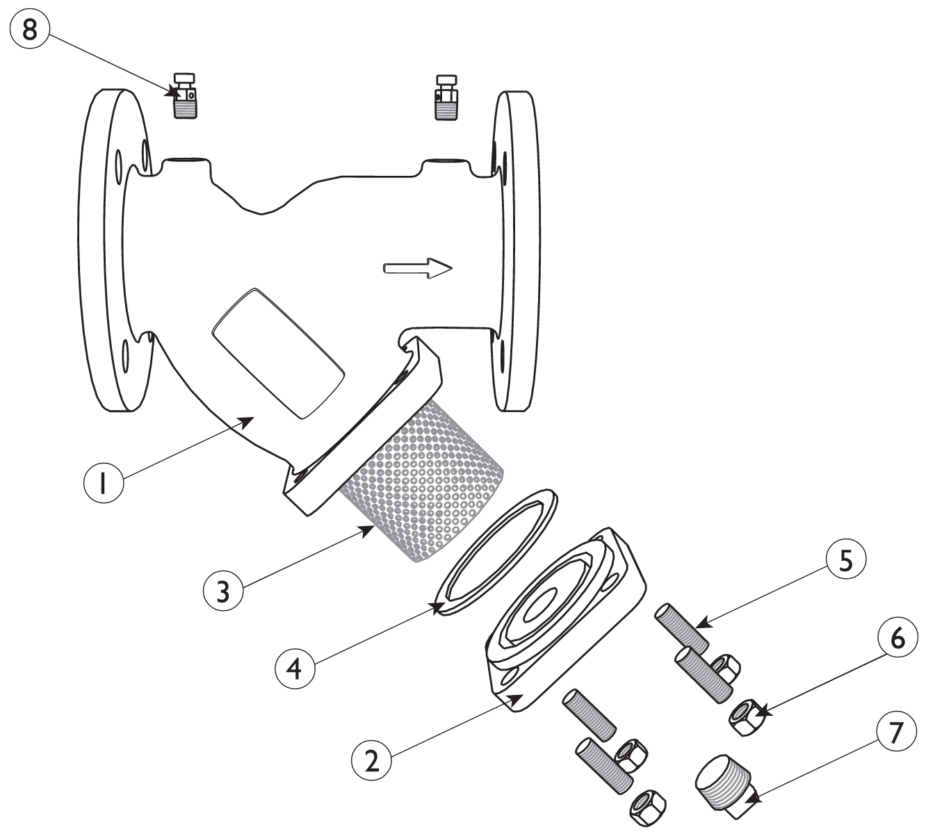 In this exploded view of a y-strainer, what is the name of part #8?