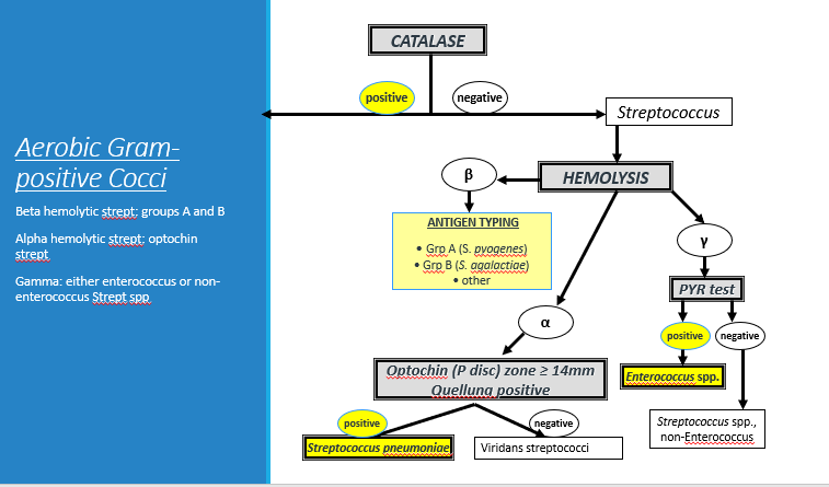 Gamma hemolysis: either enterococcus (if PYR +ve) or non-enterococcus Strept spp (if PYR -ve)