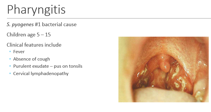 What are the clinical features of pharyngitis (esp those that point to a bacterial infection and NOT a viral infection)?
