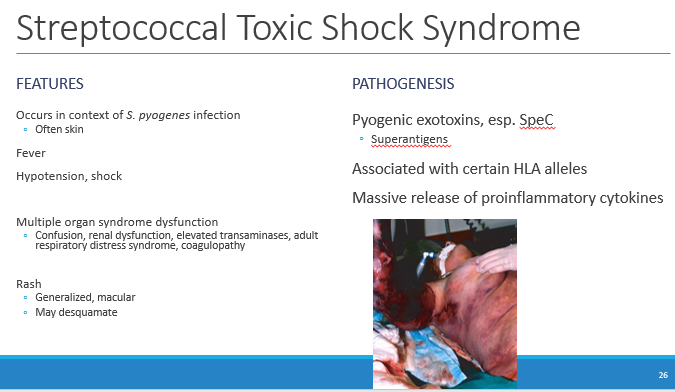 Streptococcal toxic shock syndrome is due to pyognic exotoxins (SpeA and SpeC) and results in multi-organ system dysfunction, rash, fever, hypotension and shock