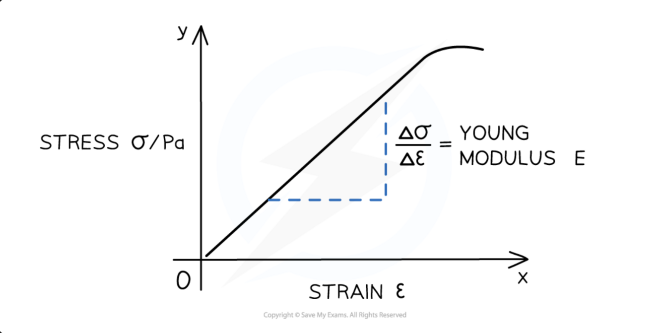 Draw a stress and strain graph and describe how to calculate young modulus from it and the link.