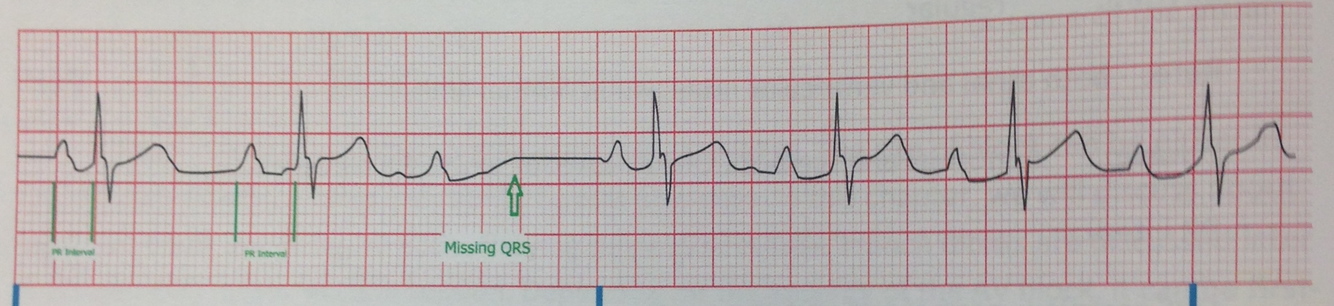 QRS complex: One complete QRS complex will be absent during pause