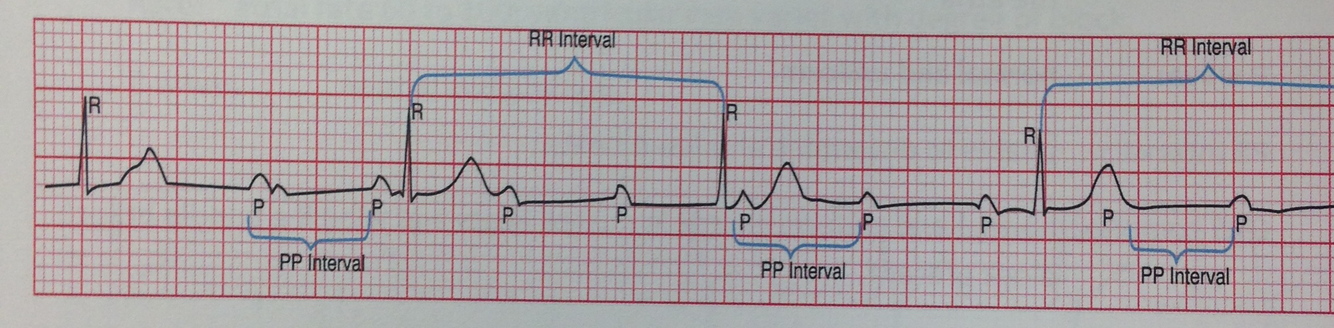 Rhythm: atrial- regular; ventricular- irregular