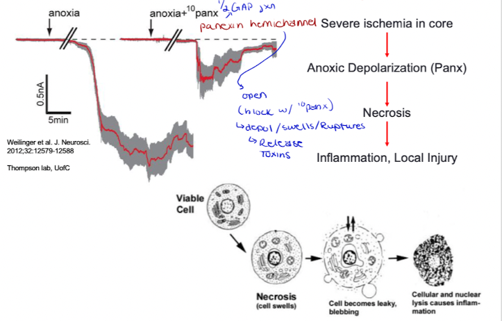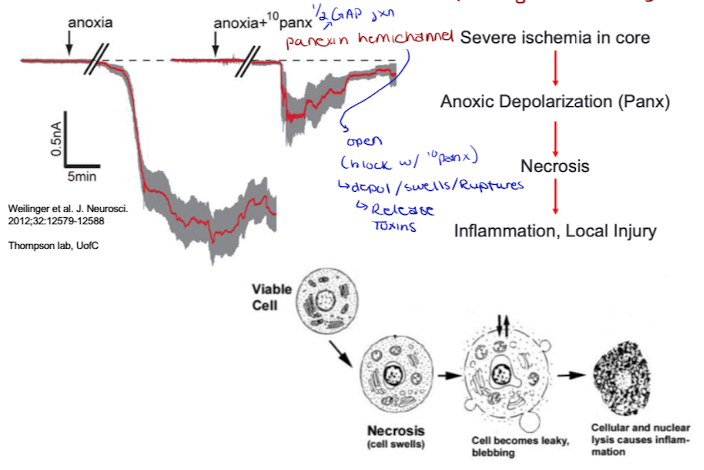 Anoxic Depolarization (Panx) → Necrosis → inflammation, local energy