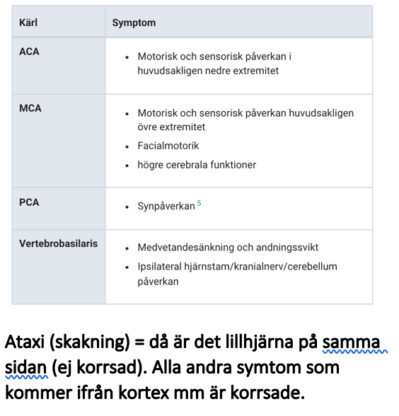 Skada i a. cerebri anterior är mer sällsynt (ca 2%) och ger symptom framförallt från nedre extremitet: