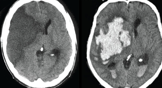 Area of hyperdensity (white)→ Hemorrhagic